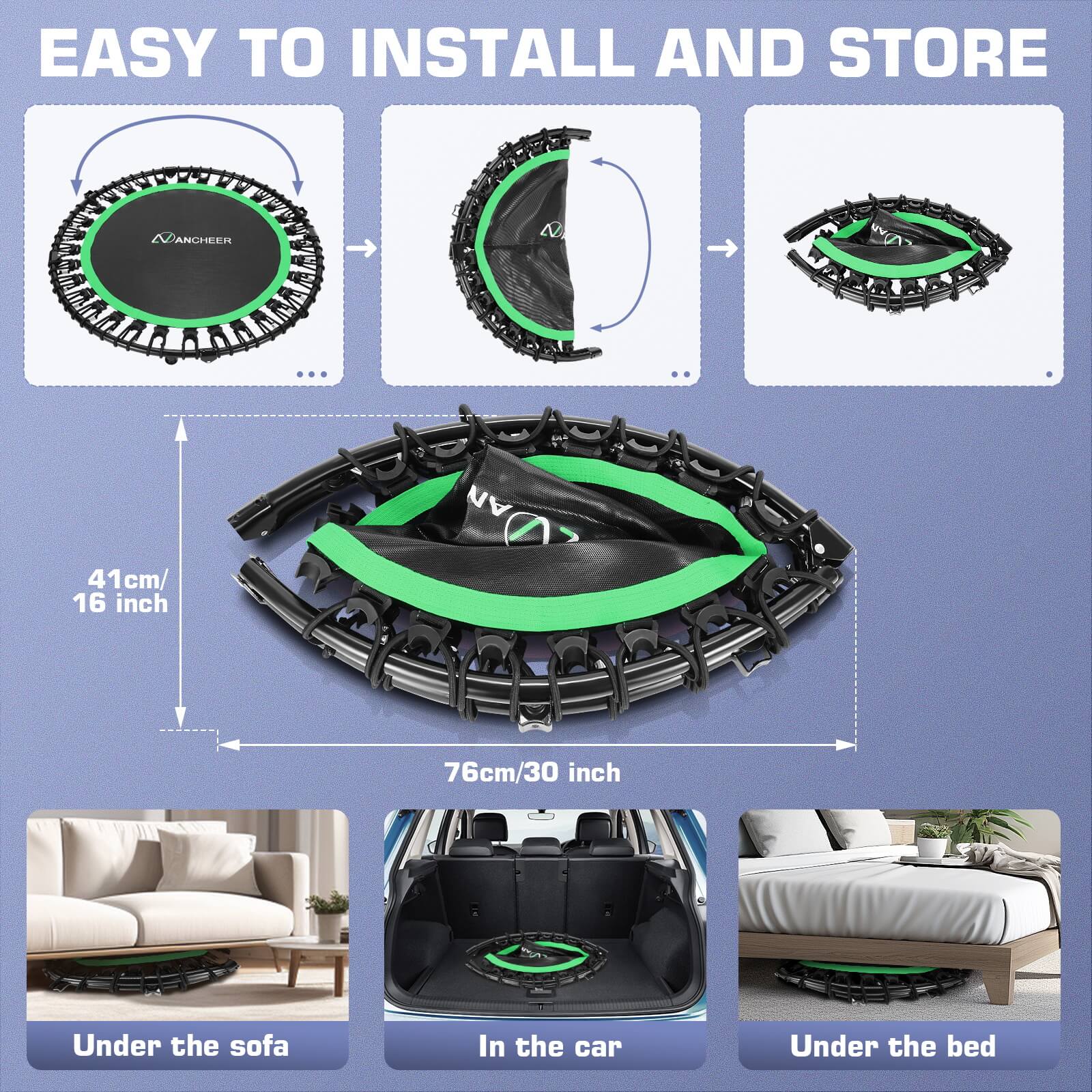 - Easy Assembly: ANCHEER fitness trampoline comes with 80% pre-assembled. Each small trampoline comes with a specific assembly instruction which has illustrated the detailed assemble steps. The jumping mat is pre-assembled with Bungees. Only 10 minutes to complete the assembly with our special tool.