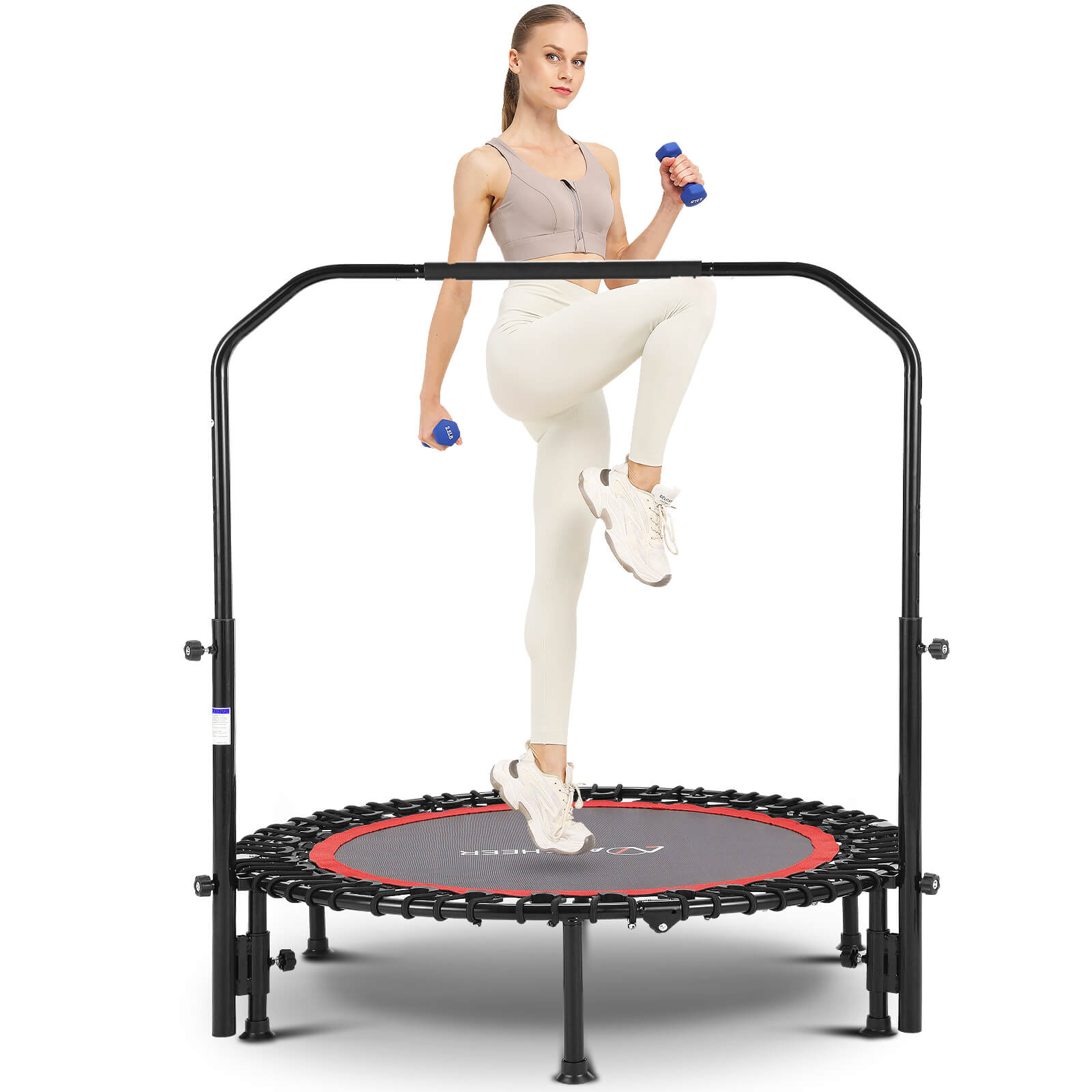 - 4-level Adjustable Handle: The fitness trampoline equipment with a 4-level height adjustable handlebar raged from 2'6" to 3'5" (on the mat). Jump with confidence.