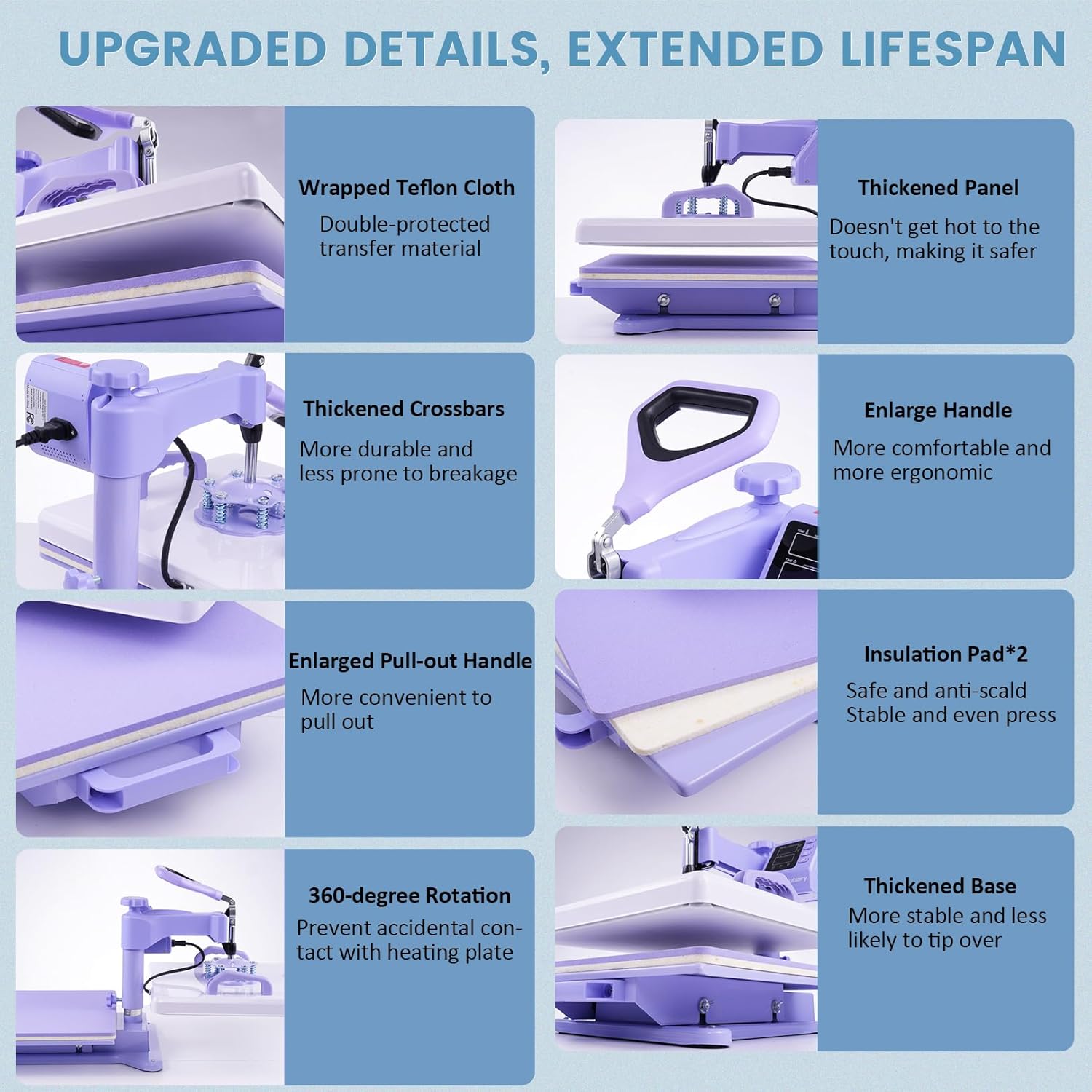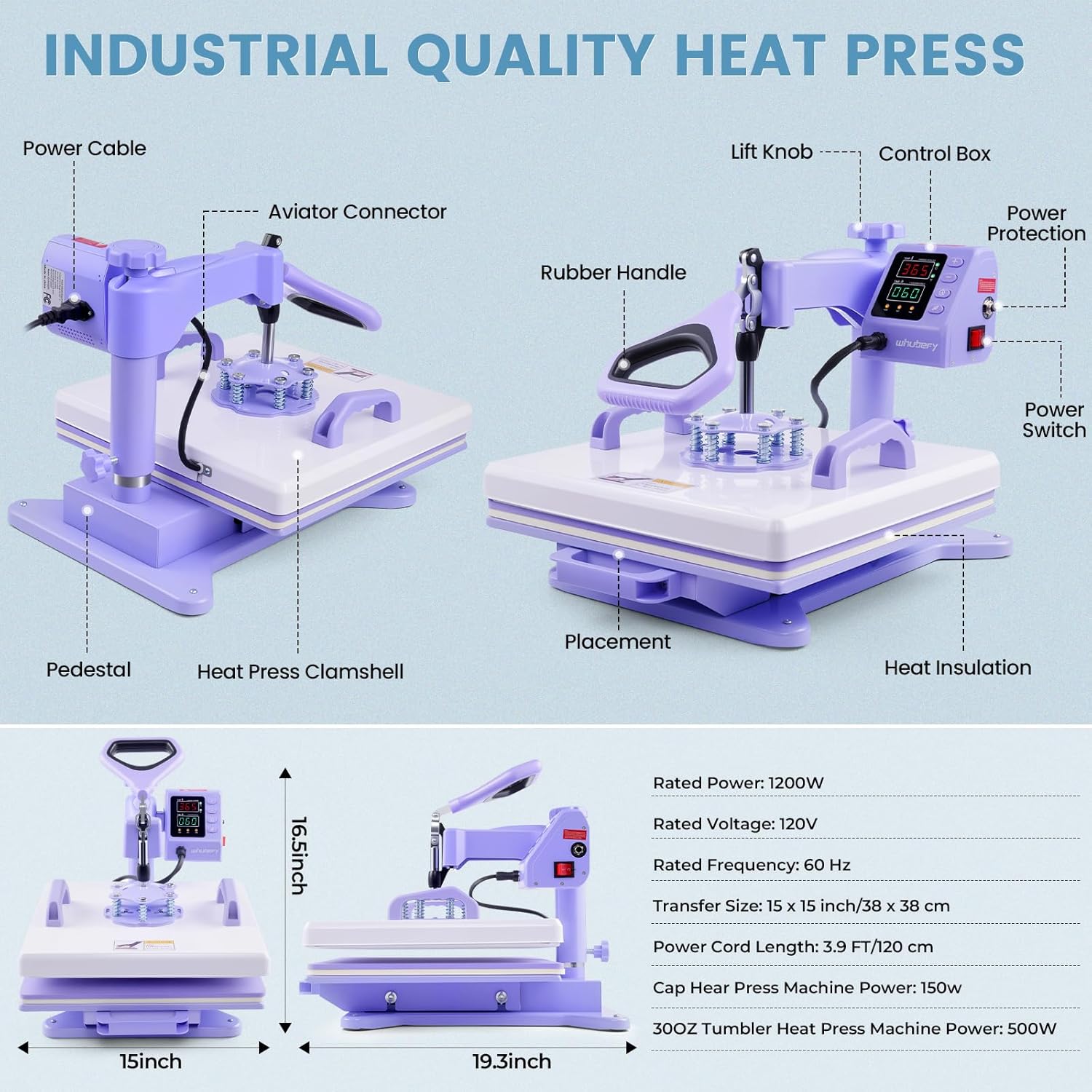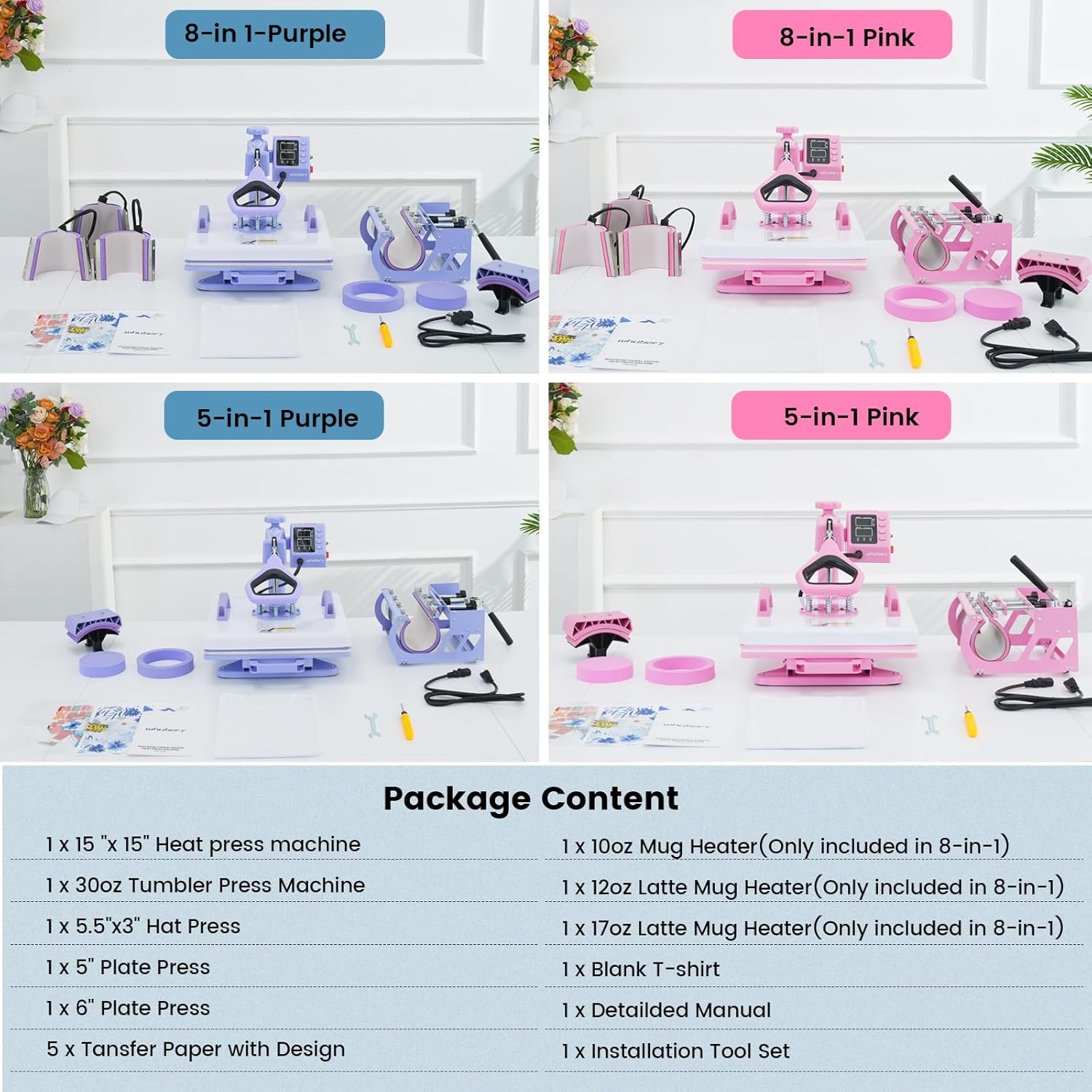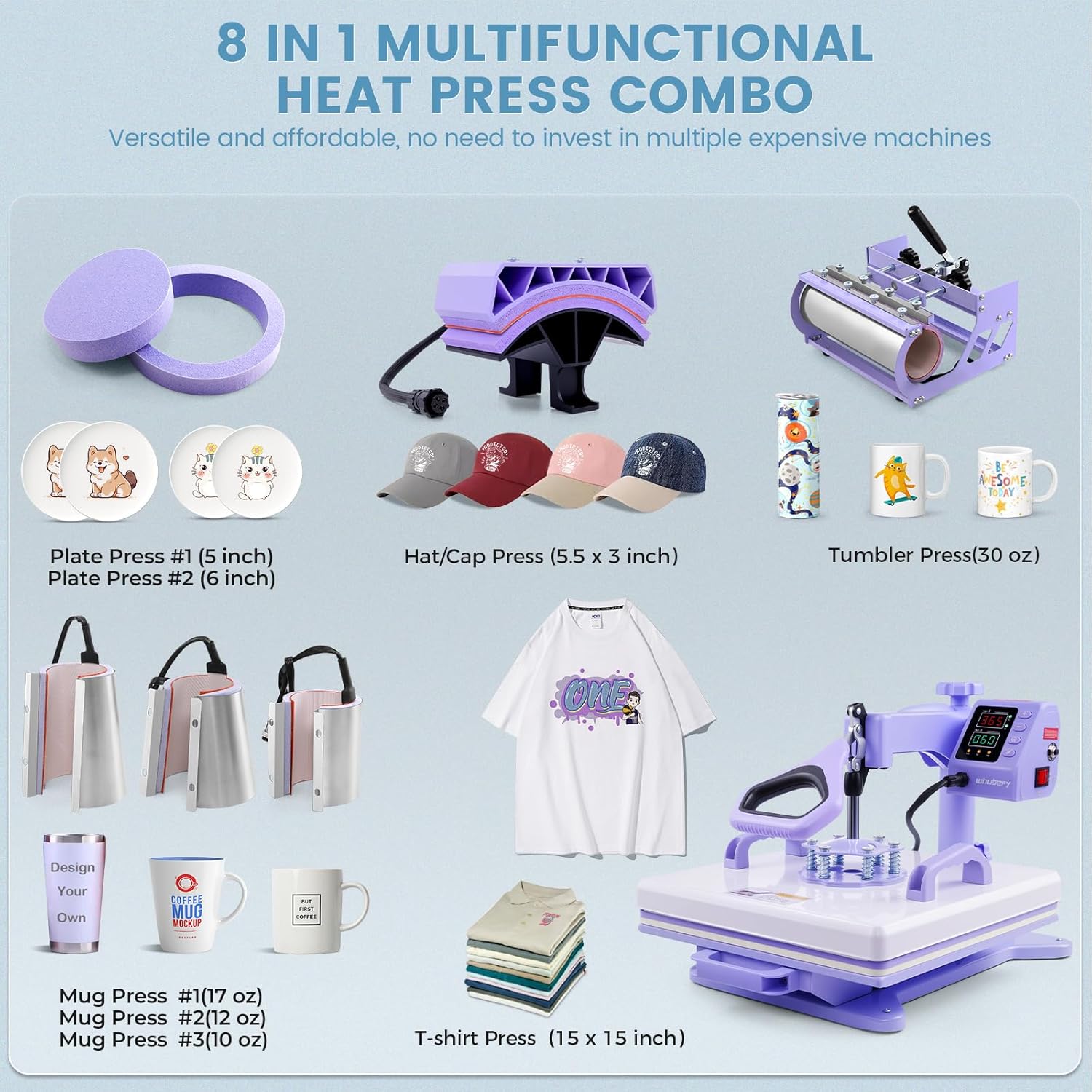 8-IN-1 MULTIFUNCTIONAL HEAT PRESS COMBO: T-shirt/Bag/Pillowcase Press (15 x 15 inch); Plate press(5 inch & 6 inch); Hat/Cap Press (5.5 x 3 inch); Tumbler Press(30 oz); Mug Press (17 oz); Mug Press (12 oz); Mug Press (10 oz)