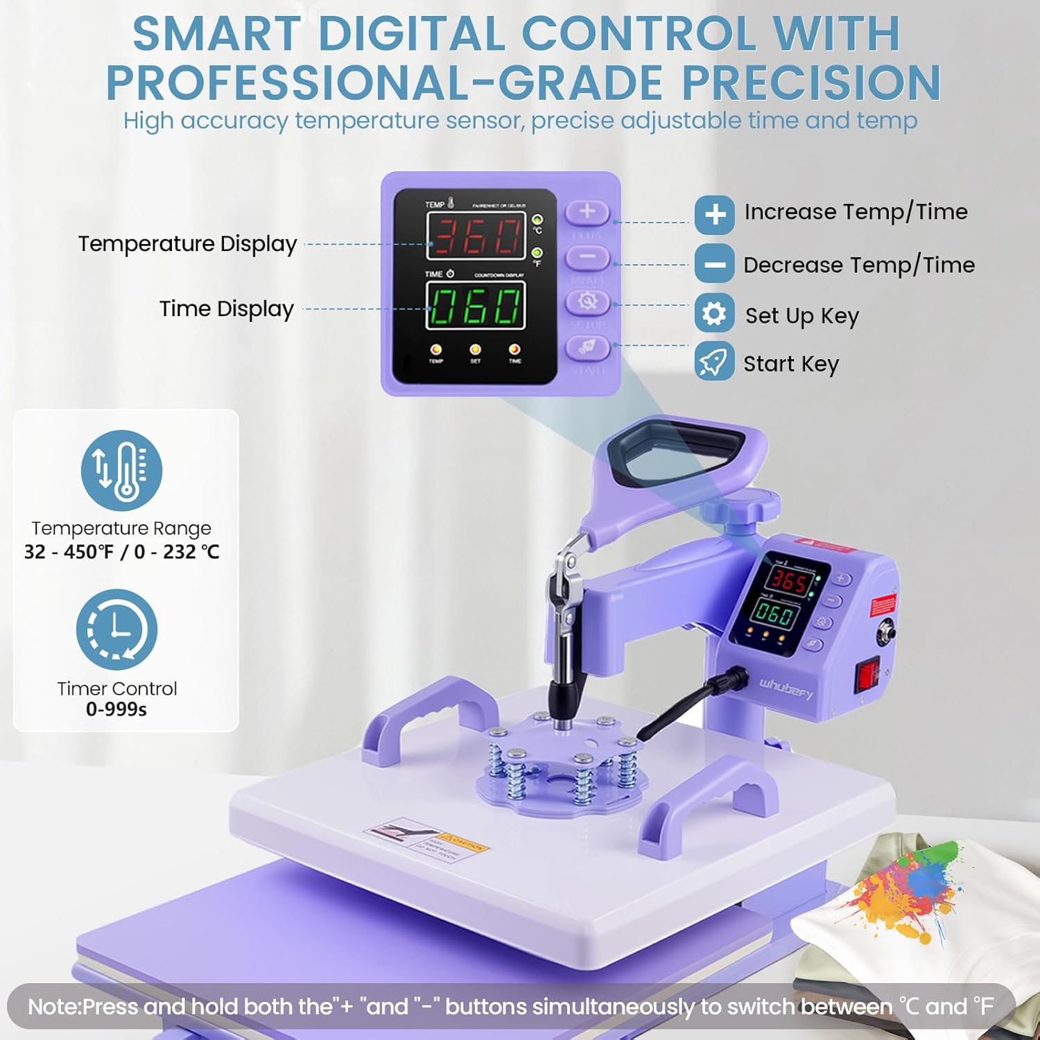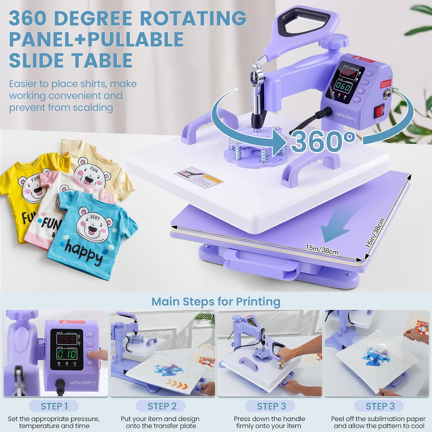 5-IN-I MULTIFUNCTIONAL HEAT PRESS COMBO: T-shirt/Bag/Pillowcase Press (15 x 15 inch); Plate press(5 inch & 6 inch); Hat/Cap Press (5.5 x 3 inch); Tumbler Press(30 oz)