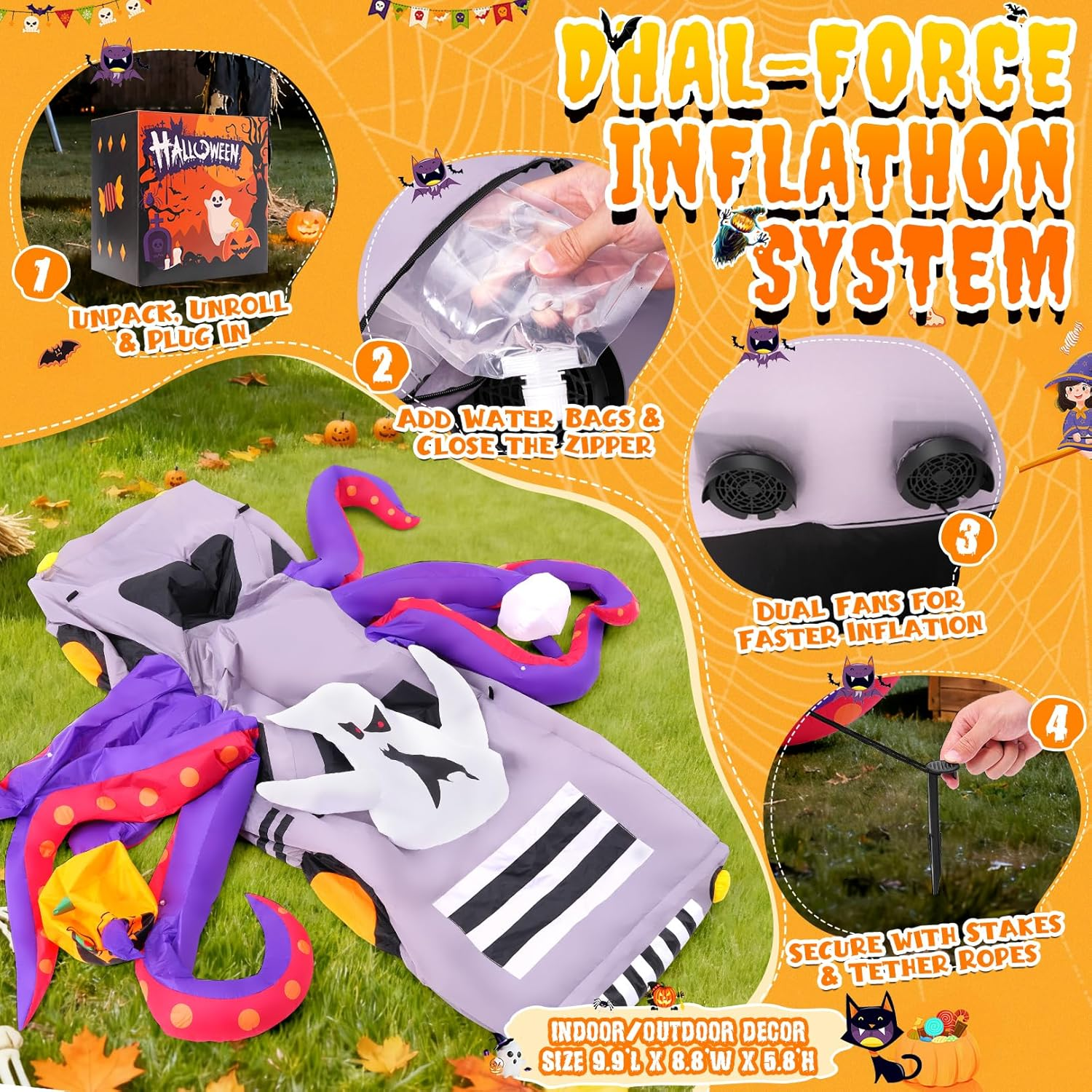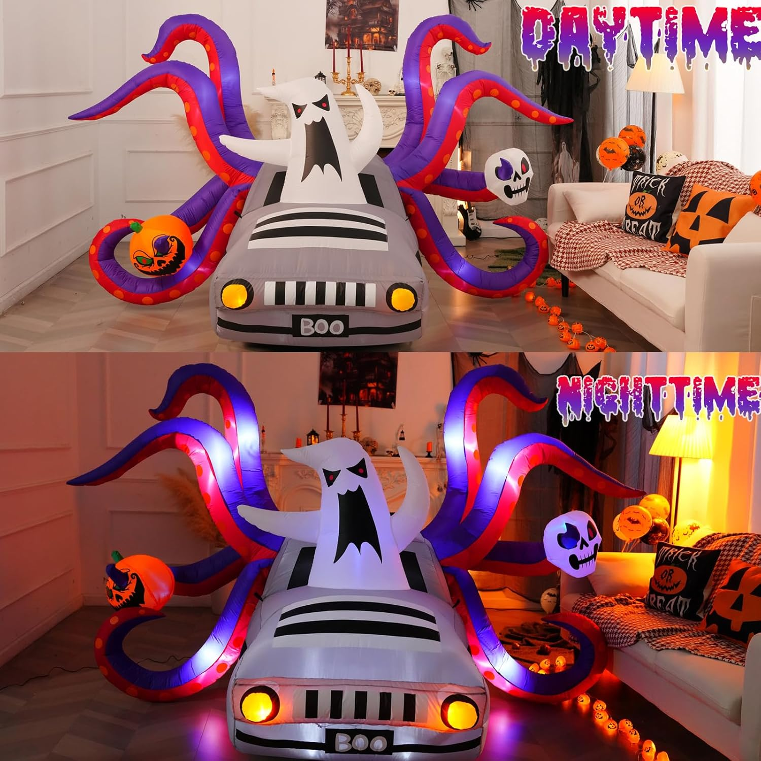 10FT Giant Halloween Inflatable Octopus Demon Car: This terrifying Halloween centerpiece features a menacing demon ghost bursting from a car hood with 8 massive octopus tentacles crashing through windows. Tentacles impale a glowing jack-o'-lantern and skull through their eyes, enhanced with 14 dynamic LED lights for a spine-chilling 360° horror experience that transforms your yard into the neighborhood's most talked-about Halloween destination!