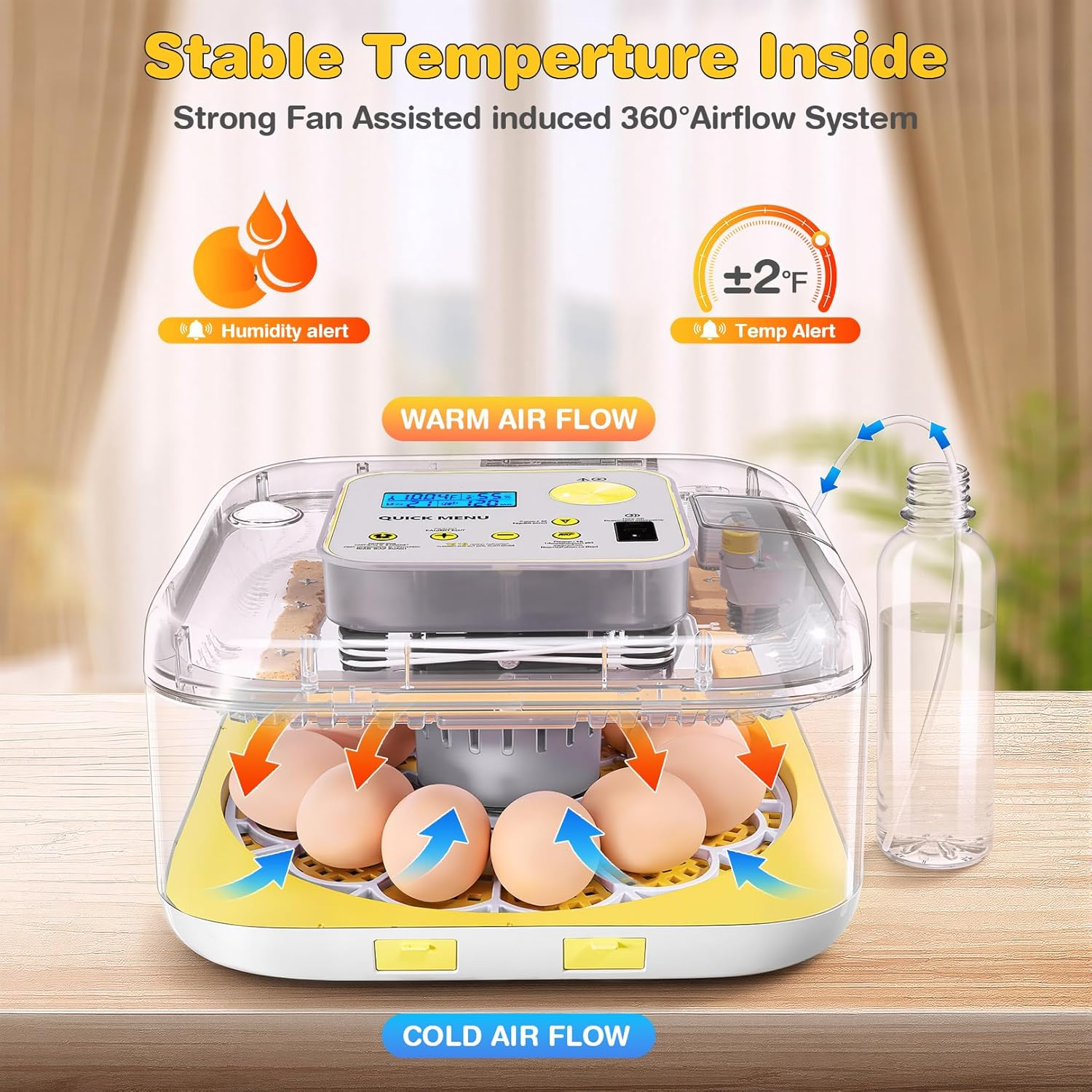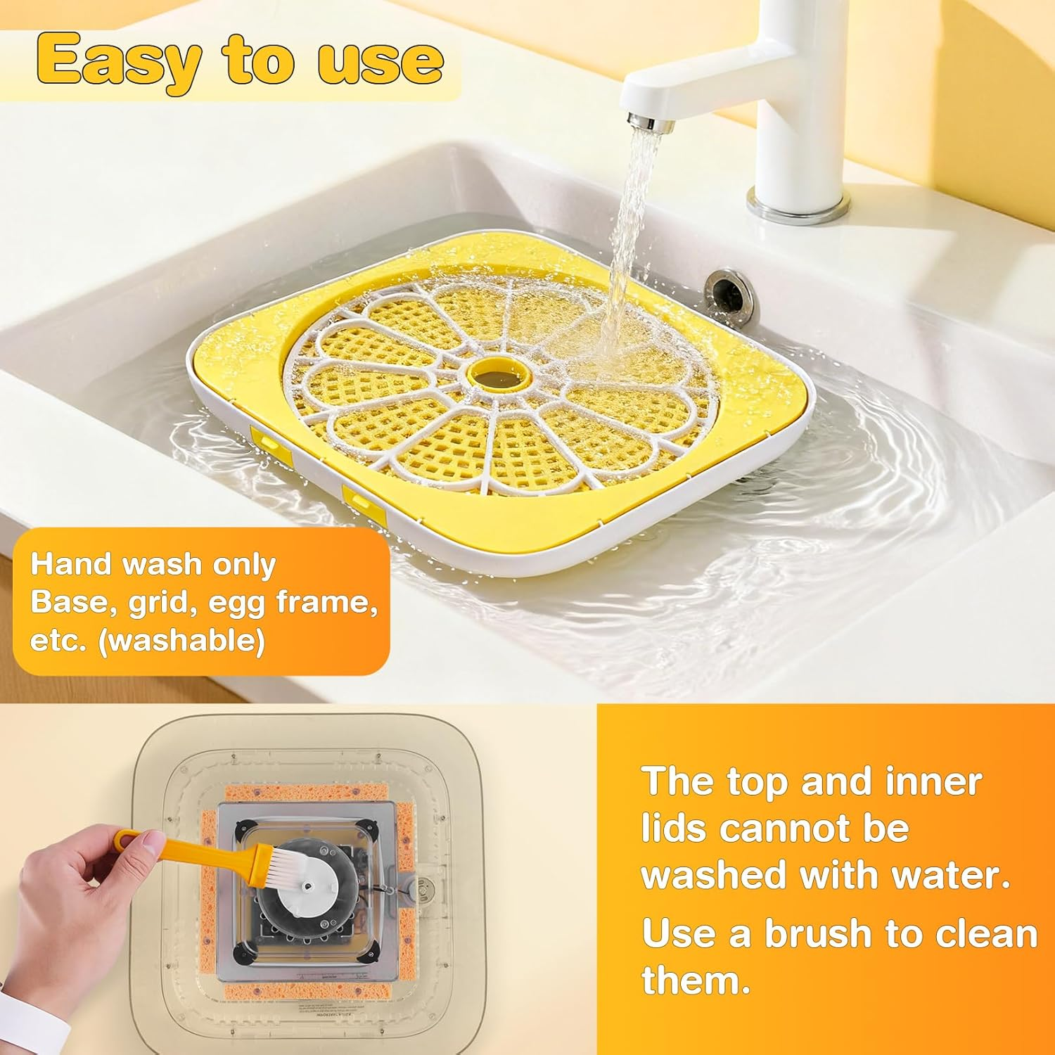 • 【Automatic Humidity & Temperature Management】 - Built-in humidity control motor automatically maintains stable moisture levels without opening the lid, reducing fluctuations. 360° airflow circulation system with strong fan ensures consistent temperature distribution throughout the chamber for even egg development.