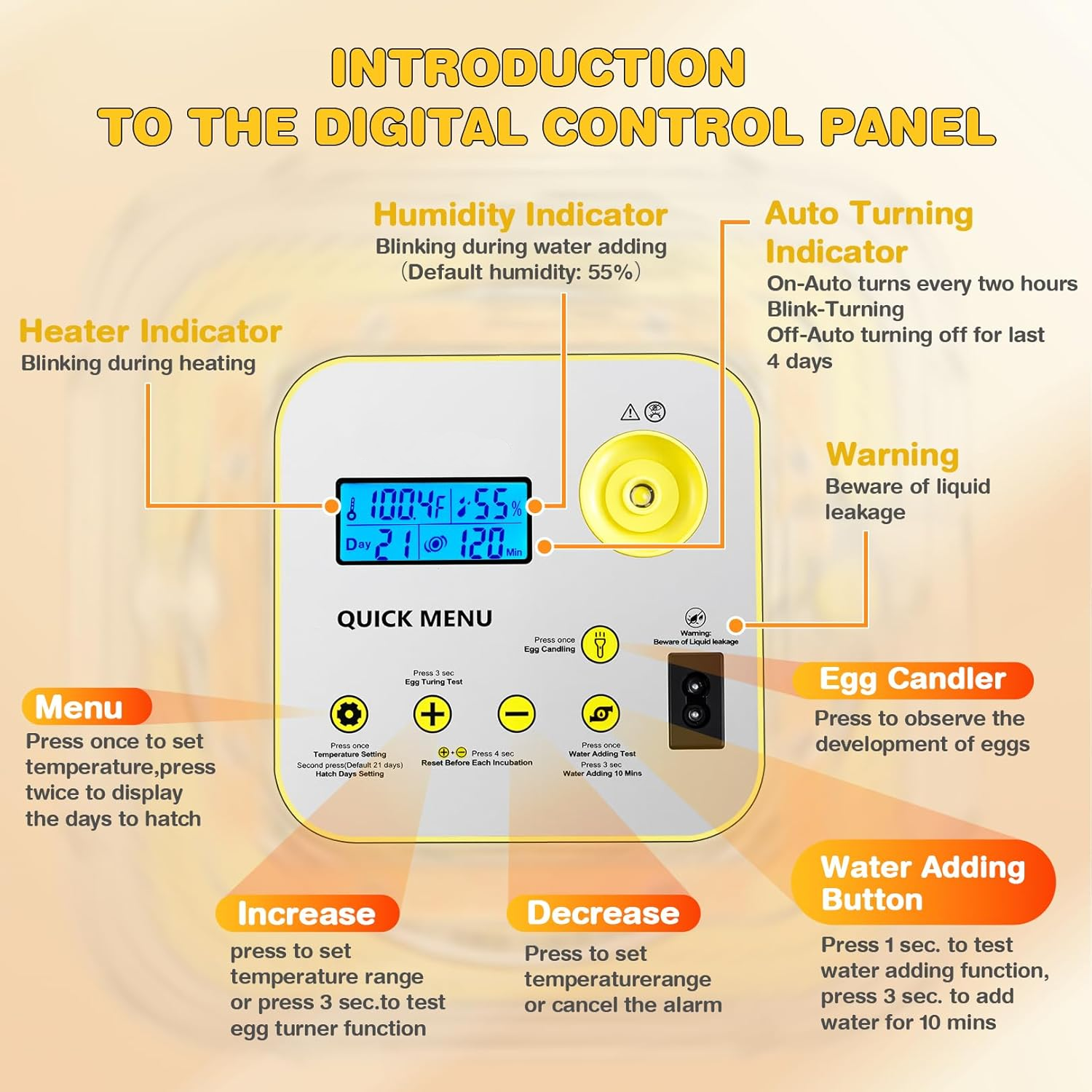 • 【Precise Digital Control & Monitoring】 - Digital display shows temperature, humidity, turning status, and incubation days at a glance. Audio alarm system alerts when conditions go out of range to ensure optimal hatch rates. Easy-to-use settings make it perfect for beginners while offering advanced features for experienced users.