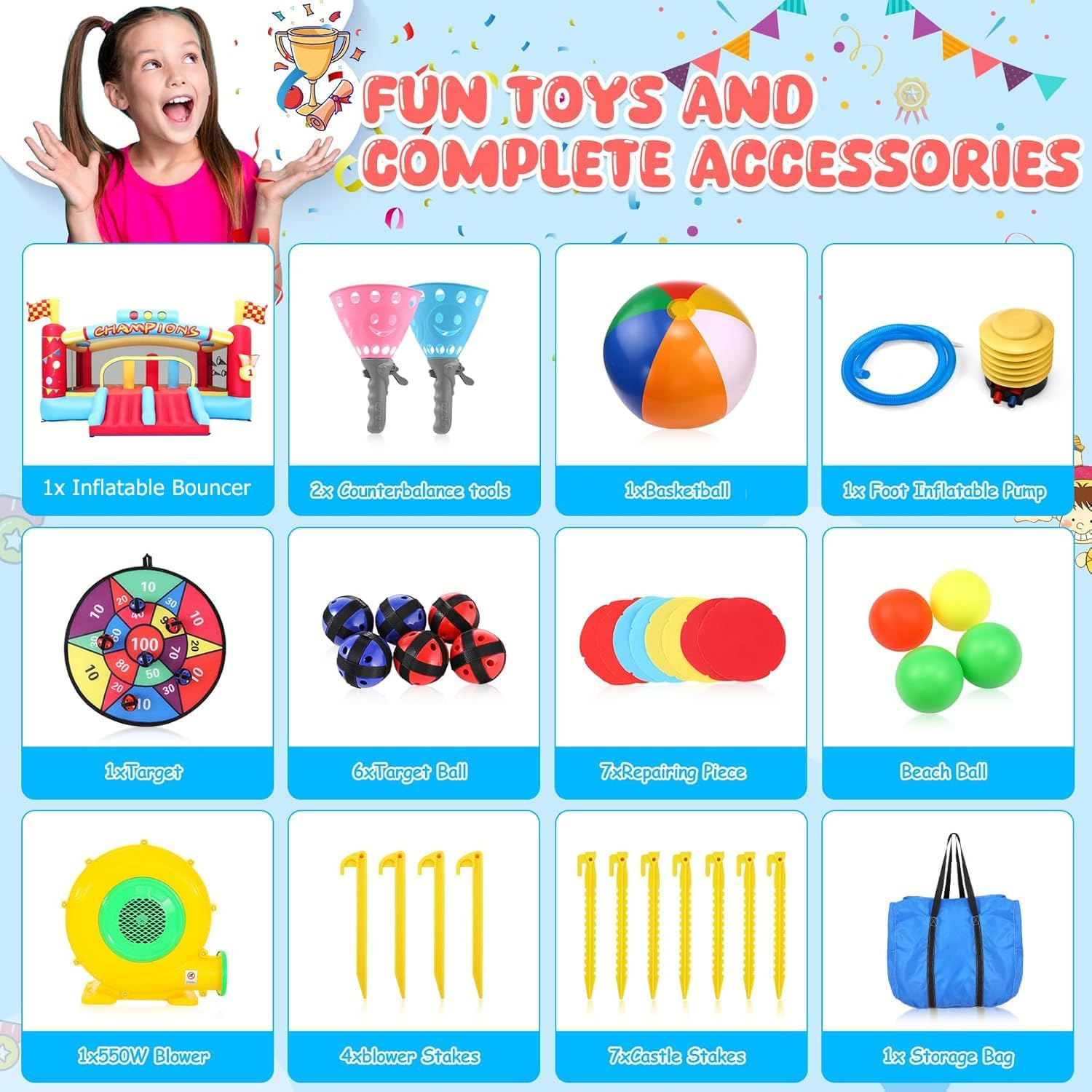 KRISRATE 13FT Large Inflatable Bounce House, Champion Theme Bouncy Castle with Blower, 2 Basketball Hoop, 2 Slide, Obstacle Poles & Target Toss Games