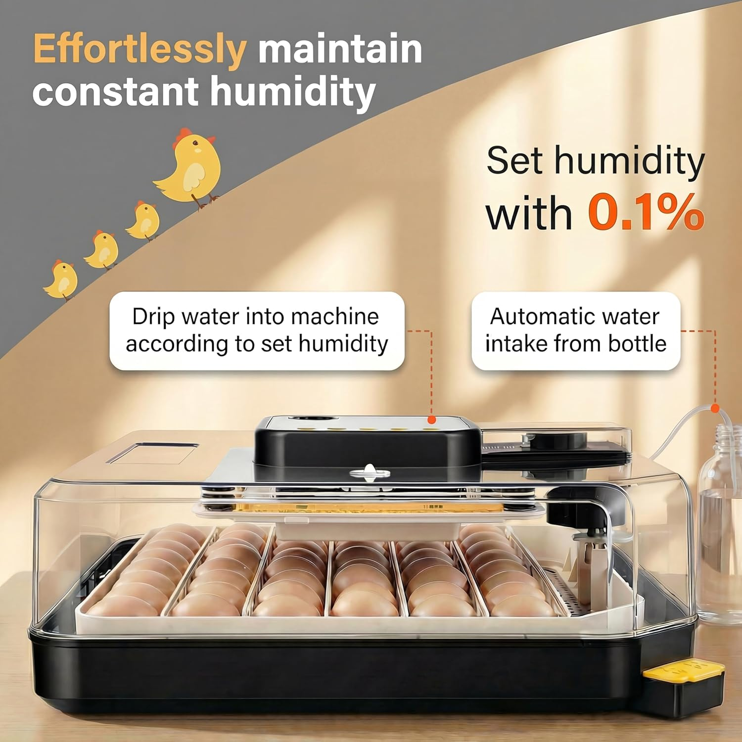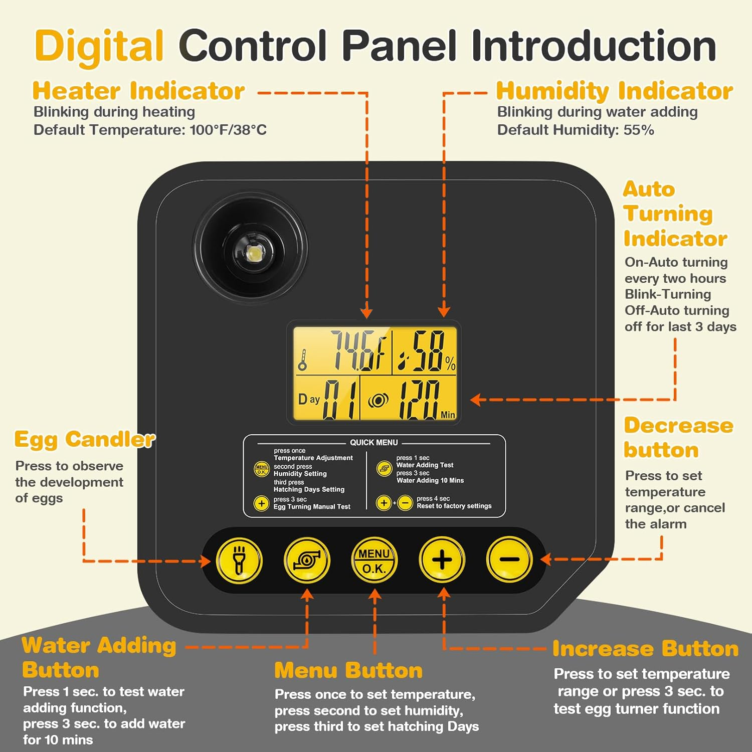 • 【Digital Precision & Auto Humidity Management】 - Digital display with 68-104°F temperature range and 20-75% humidity control (0.1% precision). Smart system automatically dispenses water from bottle with alarm notifications for out-of-range conditions.
