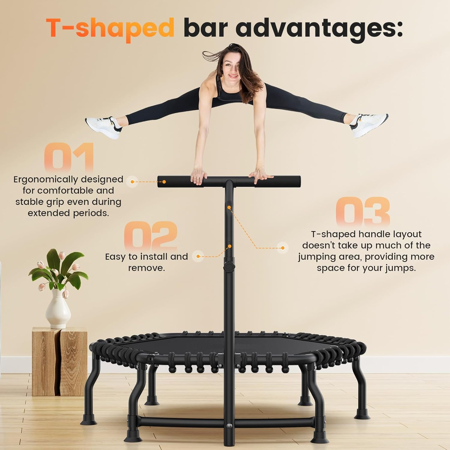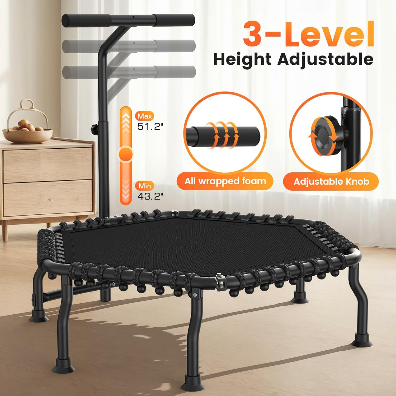 •【LARGE 50" HEXAGONAL SURFACE & ADJUSTABLE HANDLEBAR】 - Spacious hexagonal jumping surface evenly distributes pressure with ergonomic edge design to minimize fall risk. Features 3-level adjustable handlebar (43.2-51.2 inches) accommodating varying user heights for optimal comfort and safety during workouts.