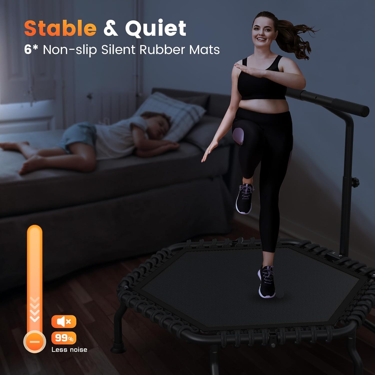 Experience premium fitness with 50" hexagonal rebounder trampoline, engineered with heavy-duty steel frame and 48 high-strength bungee cords for superior stability and safety. This space-saving foldable design reduces to less than a quarter size for easy storage while the large hexagonal jumping surface provides ample movement space with enhanced pressure distribution. Features a bent tube design for structural strength, 3-level adjustable handlebar (43.2-51.2 inches), and comes 80% pre-assembled for quick 10-minute setup. Perfect for adults and kids with waterproof jump mat, supporting multiple users for fitness or recreation.
