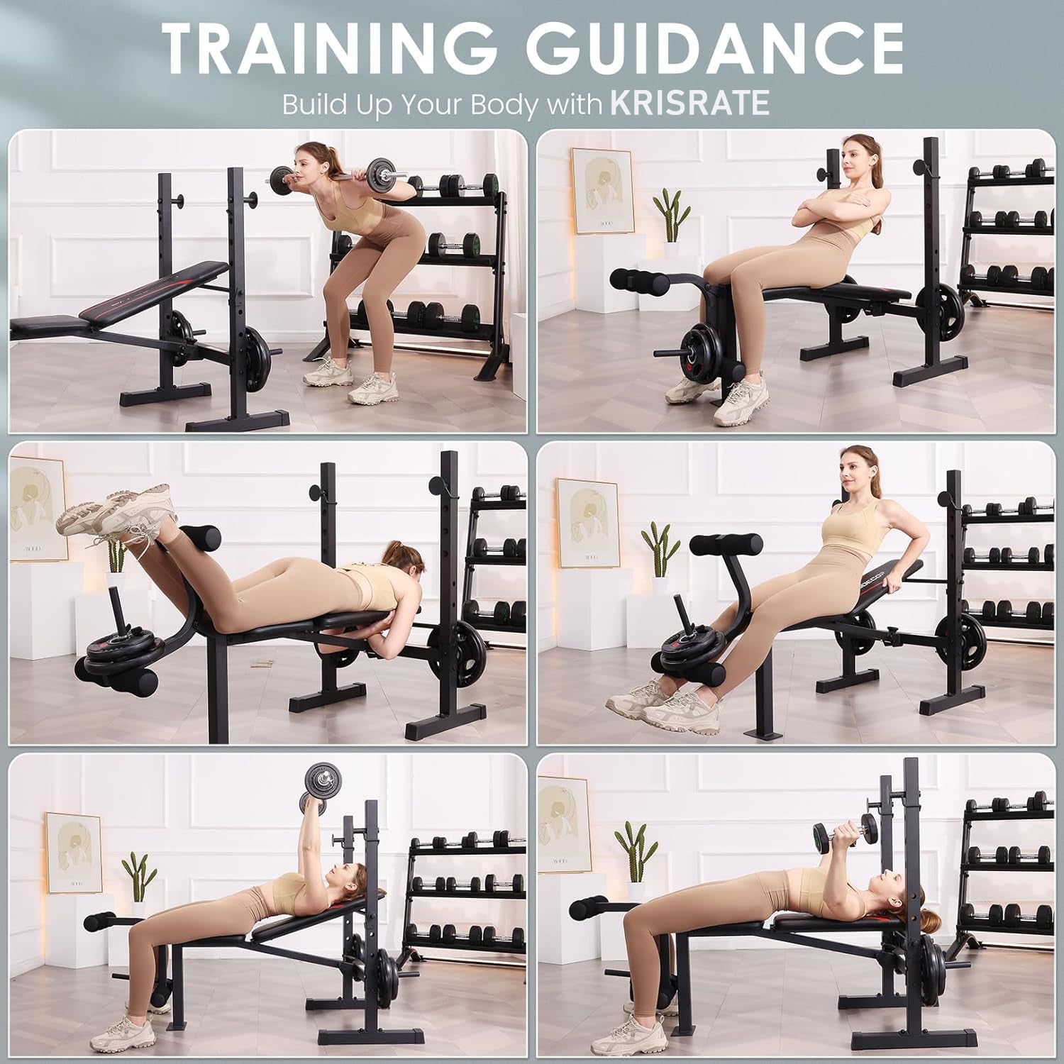 KRISRATE Standard Weight Bench Set with Squat Rack, 600LBS Adjustable Bench Press Set with Leg Extension and Leg Curl, Foldable Flat Incline Decline Workout Bench for Home Gym Full Body Training