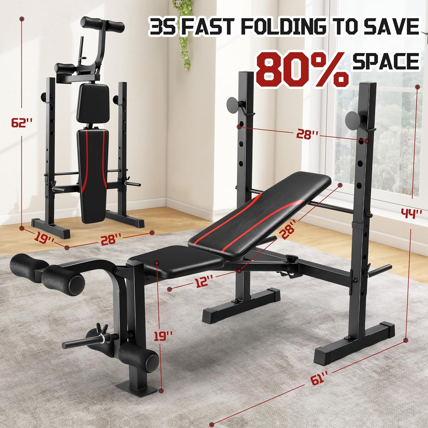 【Weight Plate Storage】: Comes with a storage rack and 1” standard-sized weight plate post for organized accessory management. Space-Saving Design: Foldable for easy storage, making it ideal for home gyms.