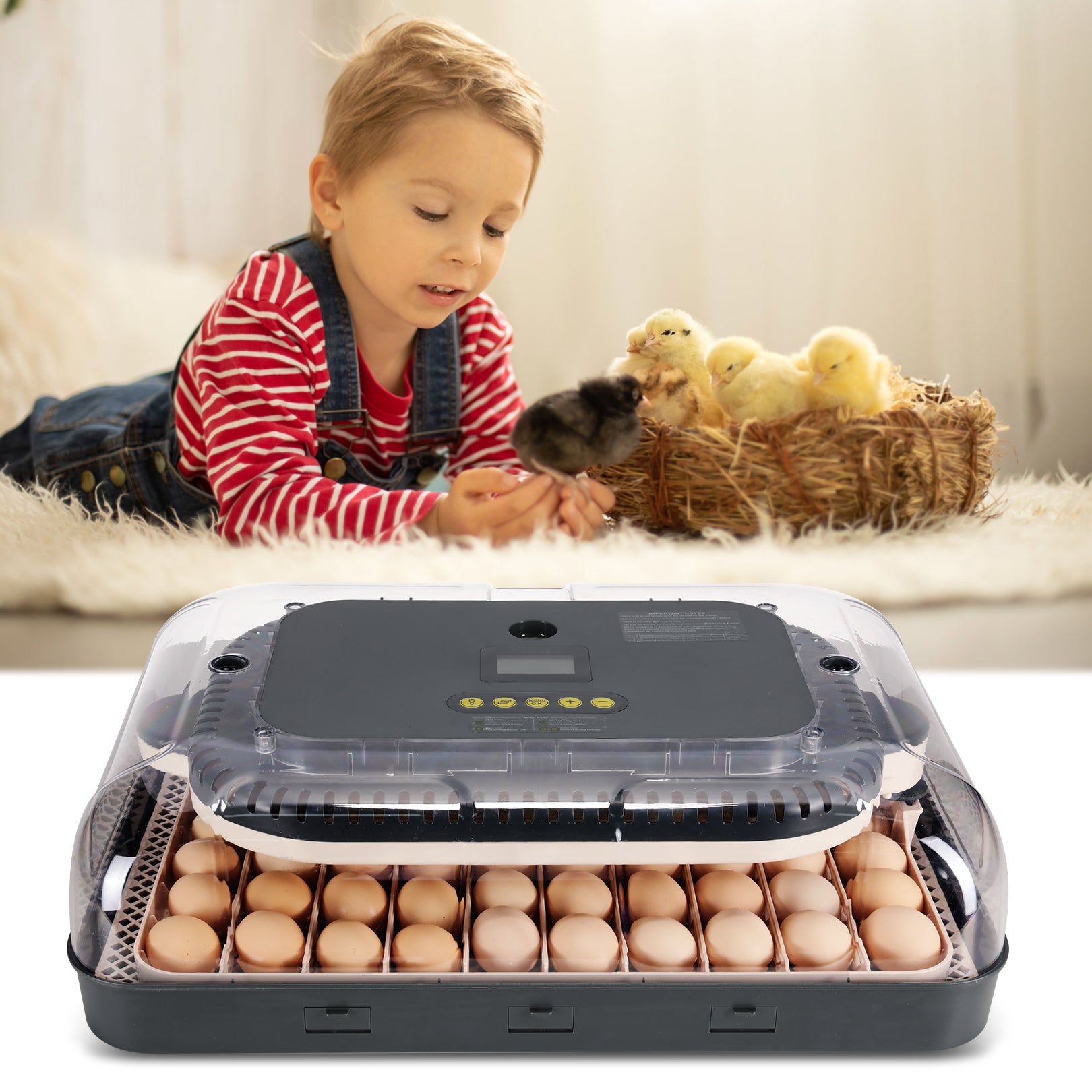 • Automatic Egg Turning & Advanced Climate Control - Built-in turner rotates eggs every 2 hours with auto-stop 3 days before hatching. 85W heating system with motor-driven fan maintains stable temperature while auto-humidification technology regulates moisture levels for improved hatch rates.