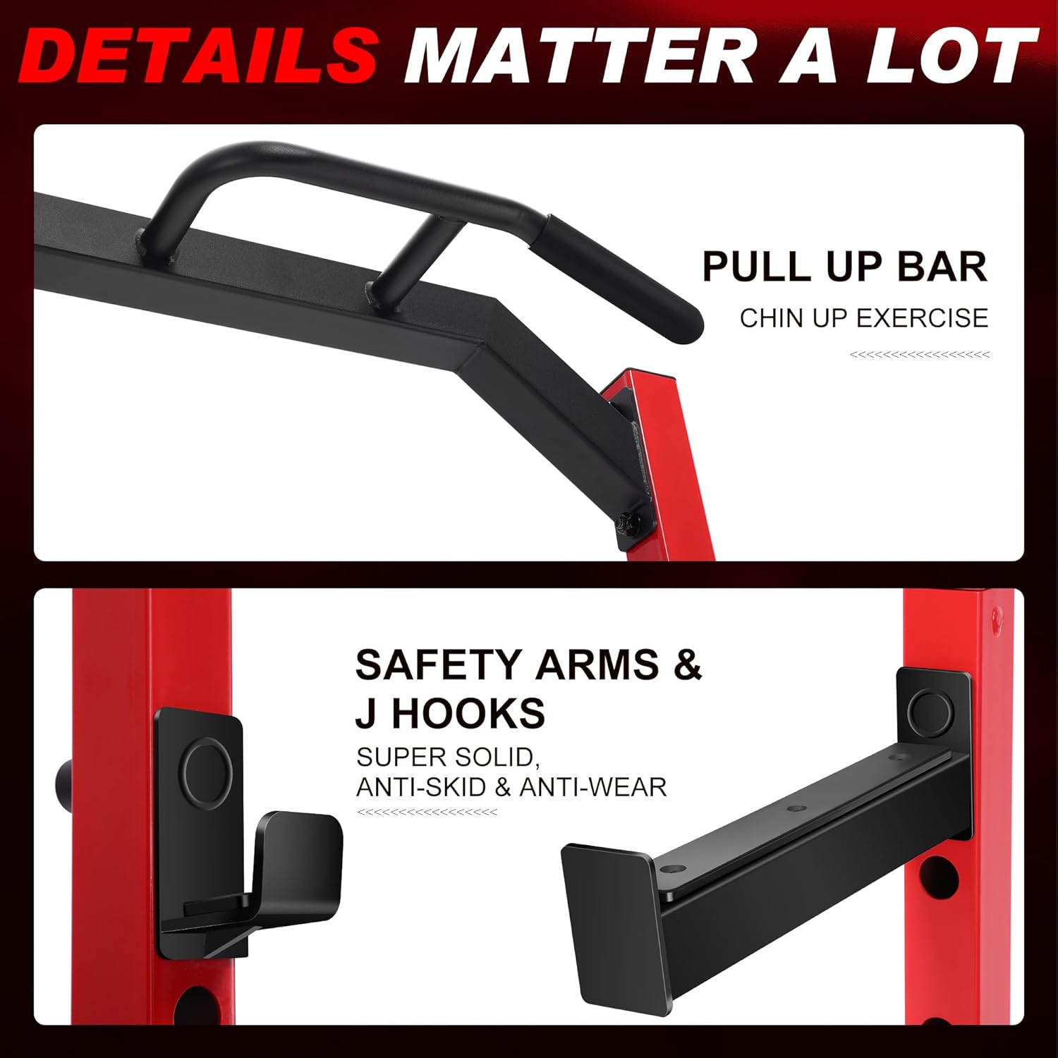Included: J-Hooks, Safety Spotter Arms, Squat Rack, Wide & Narrow Pull-up Bar
