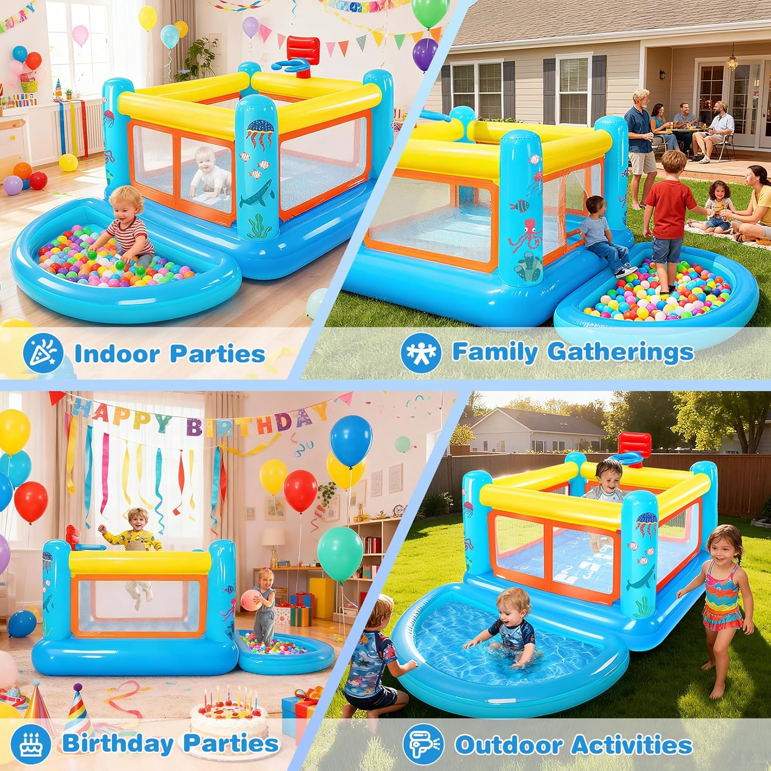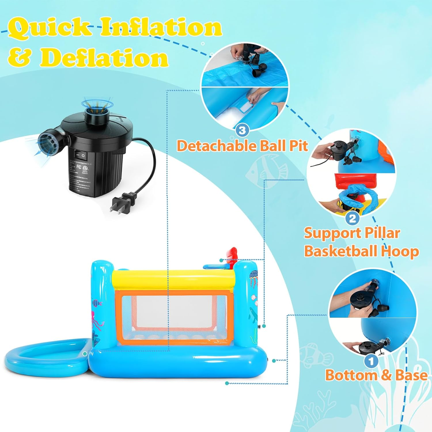 KRISRATE Inflatable Bounce House, 107"×68"×51"PVC Indoor Outdoor Bouncy Castle with Removable Ball Pit Pool, Basketball Hoop,Hopscotch Game&Air Blower