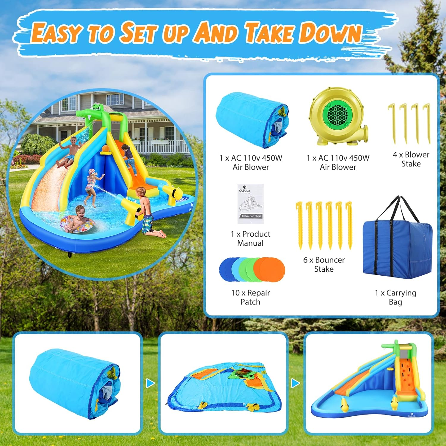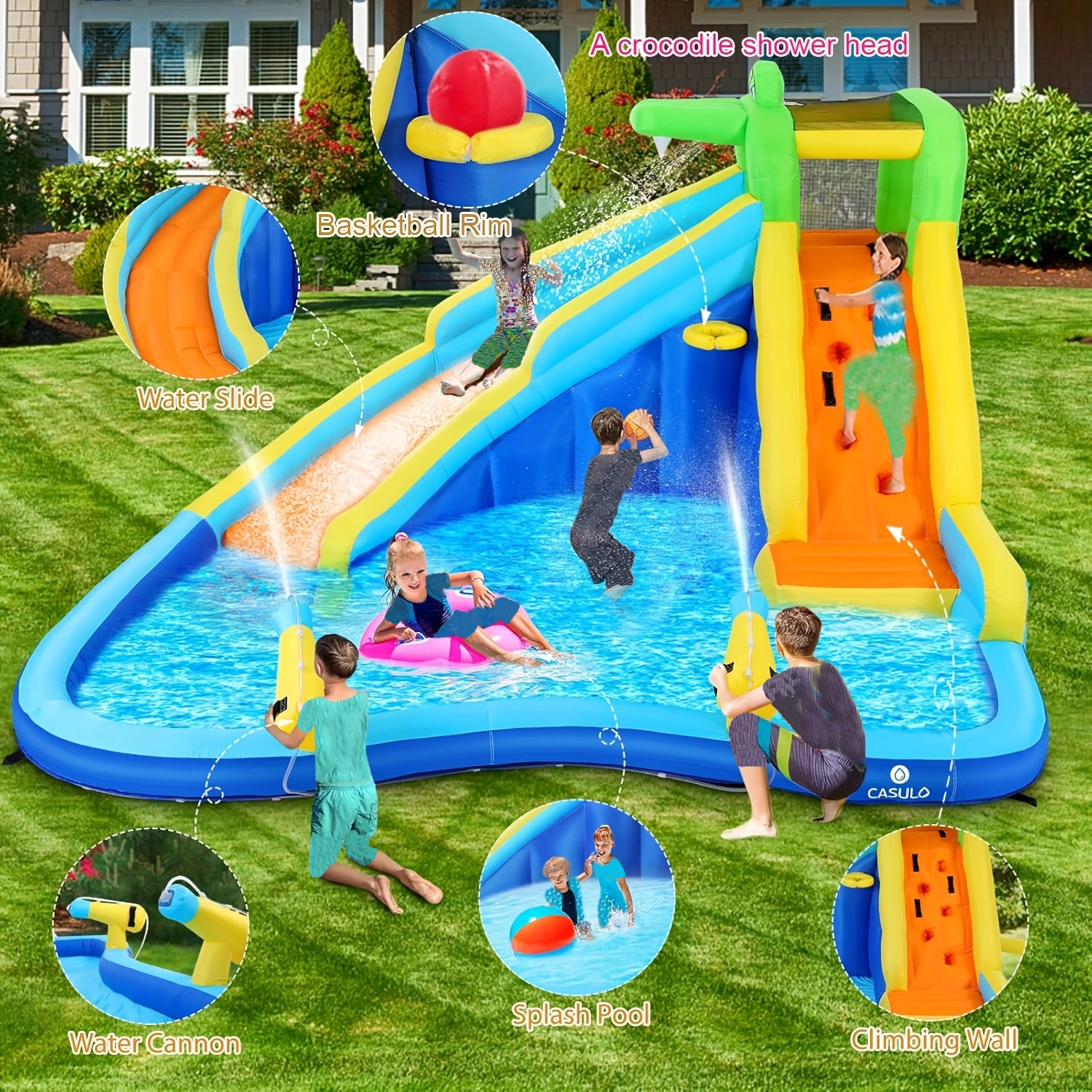 • 【8-IN-1 WATER WONDERLAND】 - Features dual water sprayers, basketball hoop, climbing wall, 9.7ft water slide, 13ft wide splash pool, and crocodile sprinkler for non-stop entertainment in your backyard.