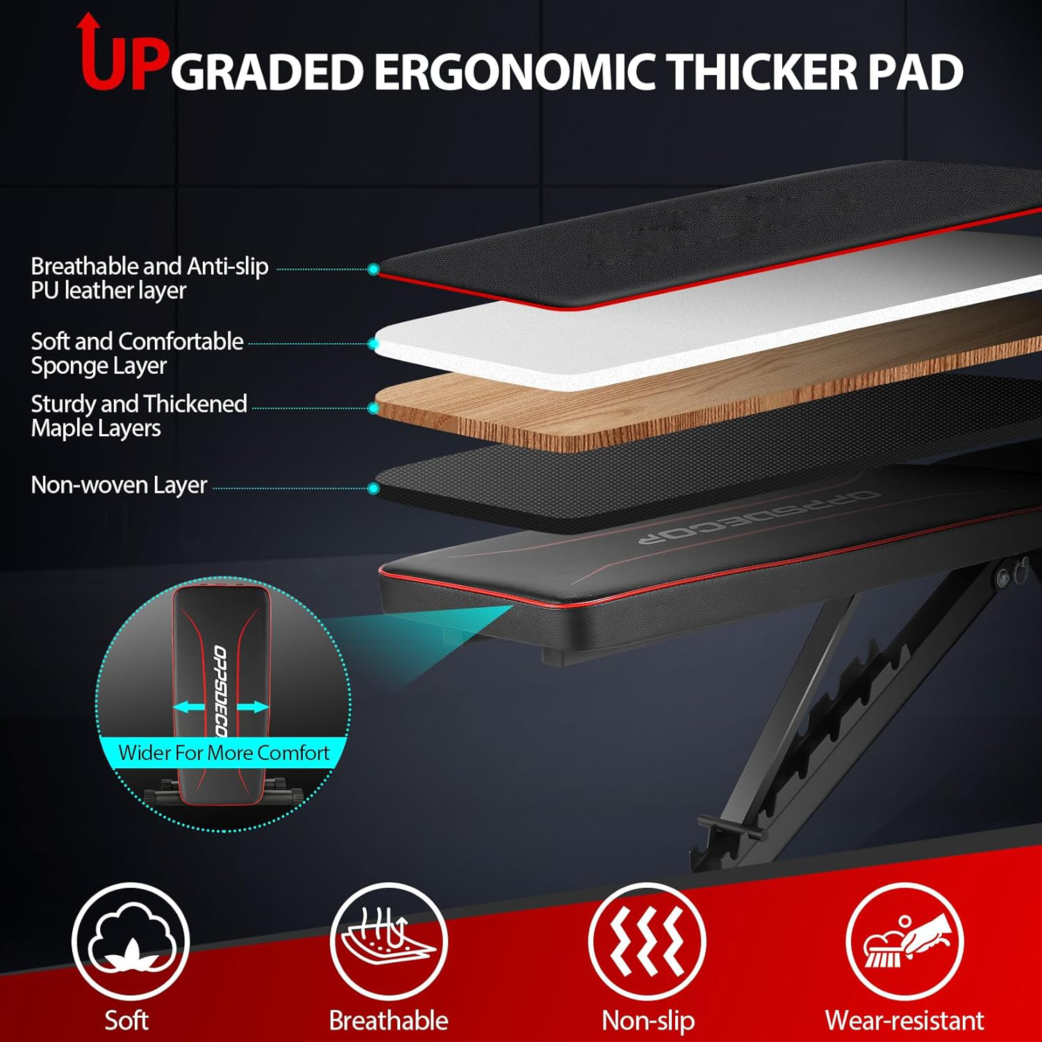 The KRISRATE Weight Bench features an ultra-wide stabilized base to eliminate wobbling during workouts. Built with high-quality steel for true 660lbs capacity, it offers 8 adjustable backrest positions for incline, flat, and decline exercises. The bench includes 4 high-density support foams, premium sweat-proof leather padding, and quick 3-pin folding for easy storage. Perfect for targeting all major muscle groups while saving space and gym costs.
