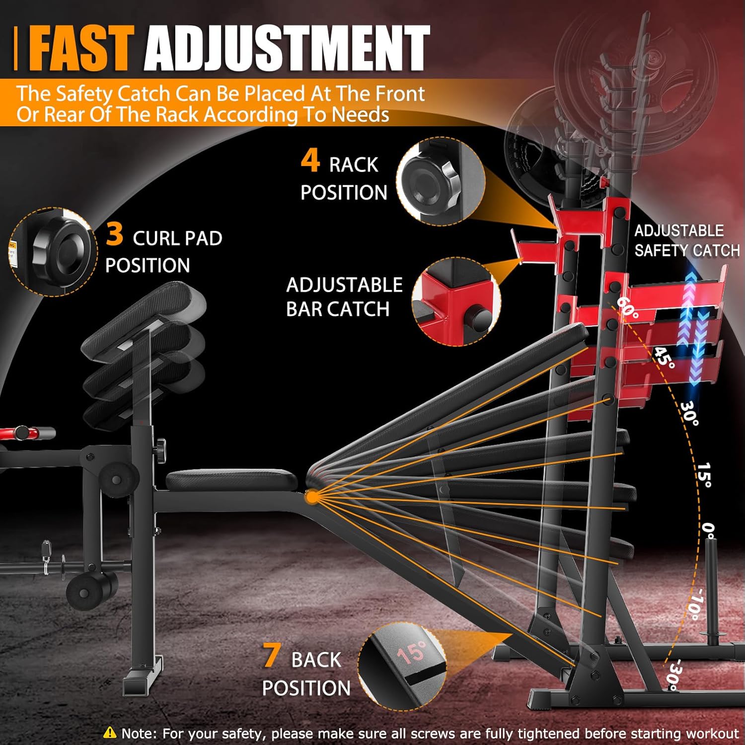 KRISRATE Weight Bench Set with Leg Extension and Curl, 900LBS Bench Press Set and Barbell Rack with Safety Spotter Catches, Preacher Curl for Home Gym